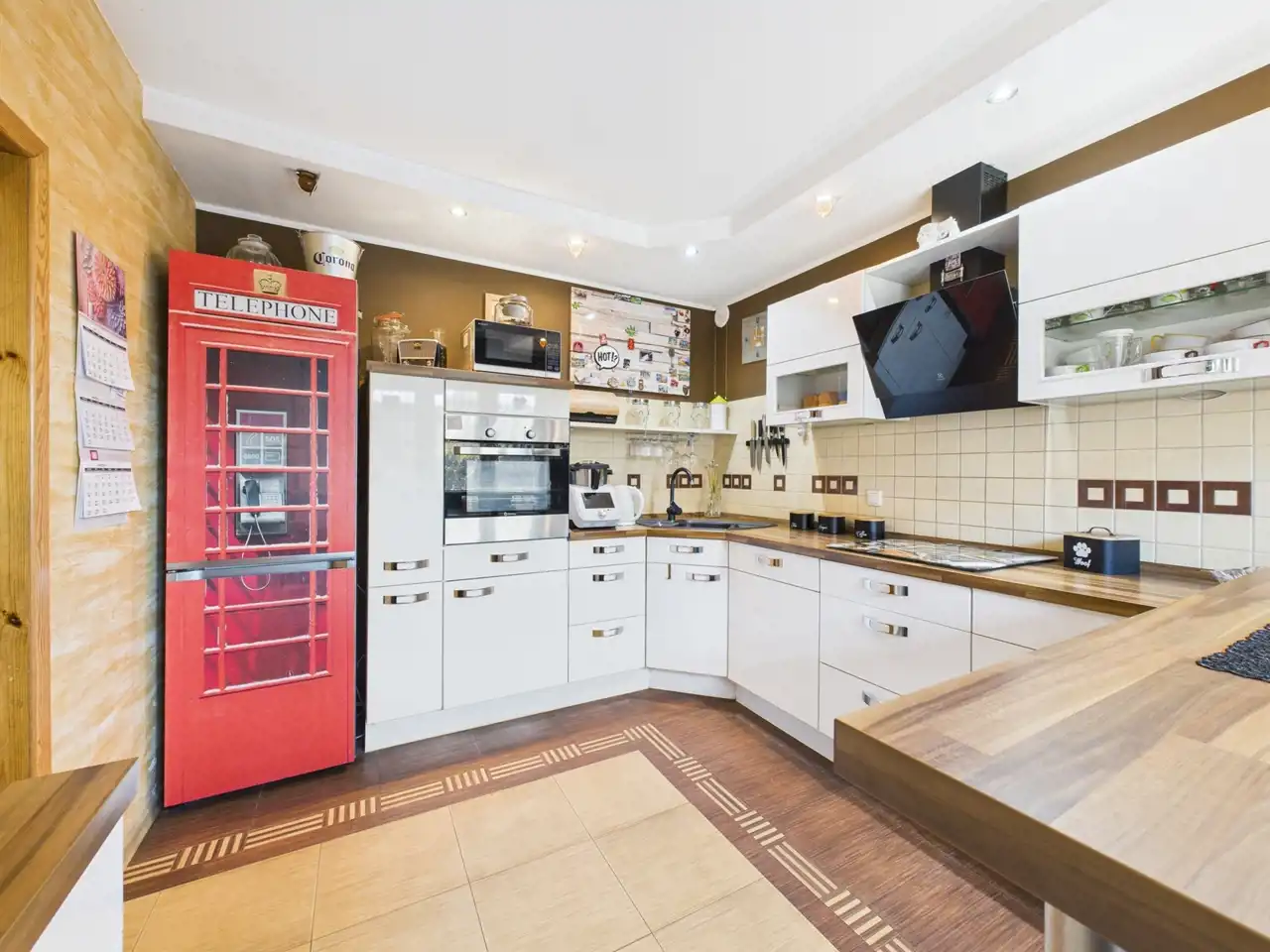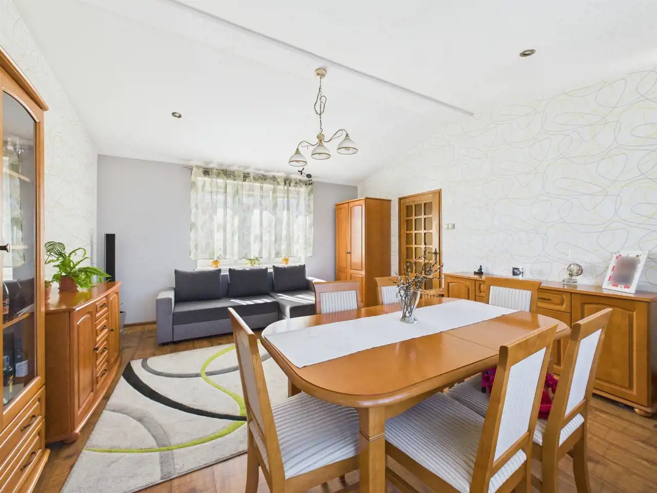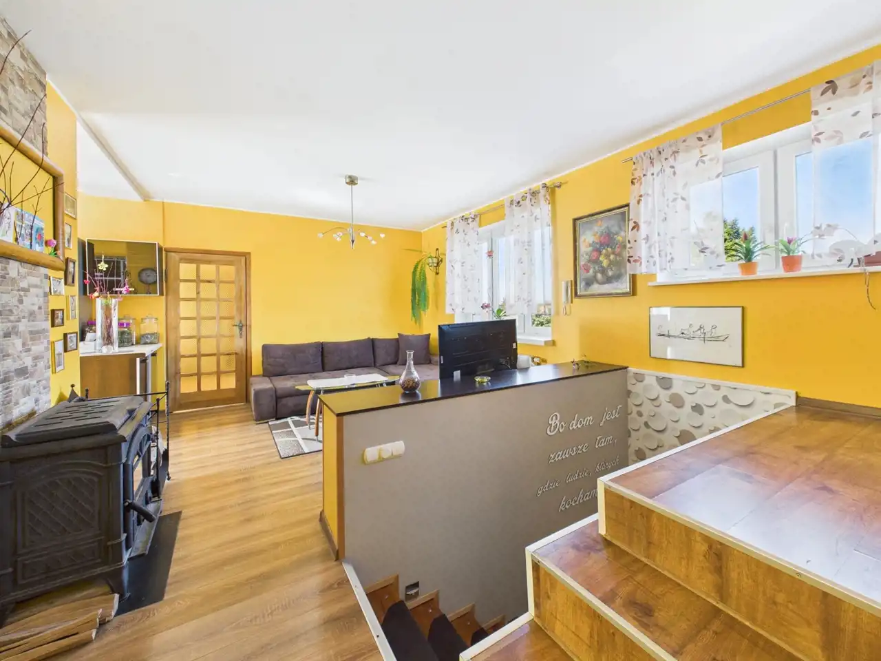 - Kuchnia z piecem gazowym, połączona z przestronnym salonem, w którym znajduje się kominek wolnostojący typu "KOZA" – doskonałe miejsce na rodzinne wieczory przy ogniu. Do mieszkania przynależy także piwnica z pralnią i spiżarnią, co dodatkowo zwiększa funkcjonalność tej przestrzeni.