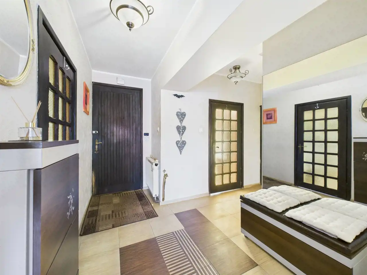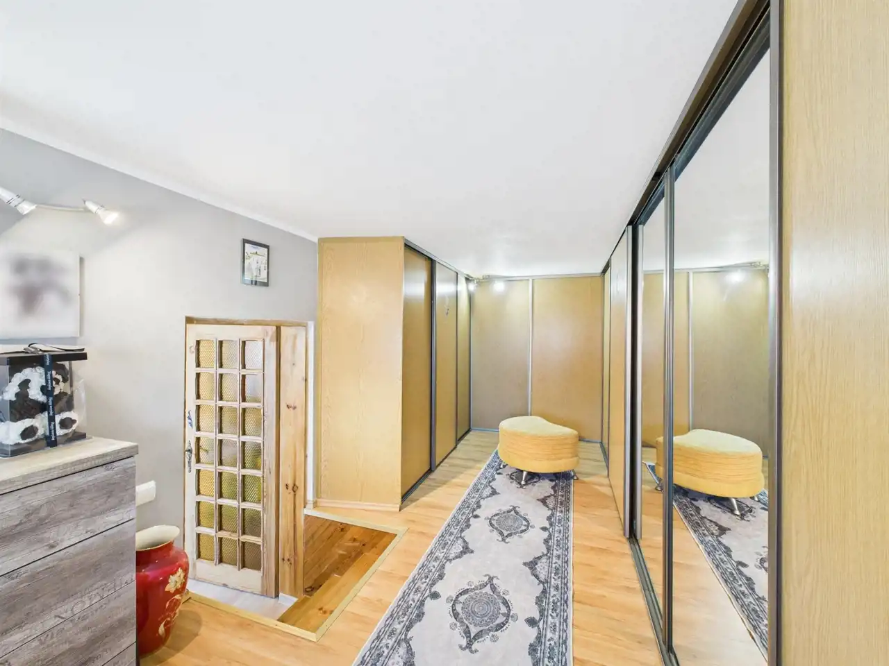 - Przestronna garderoba z zabudowanymi szafami i drzwiami przesuwnymi,