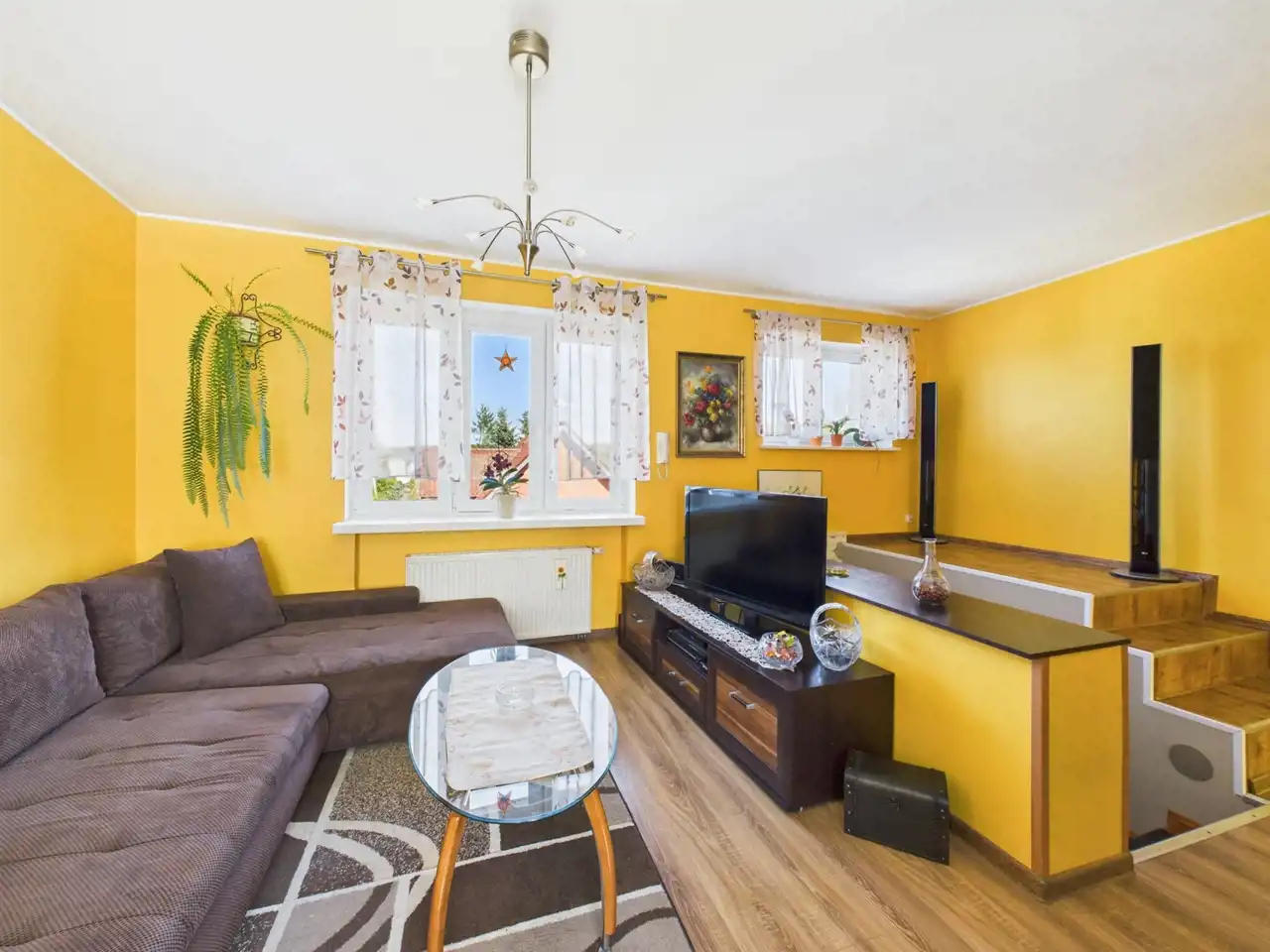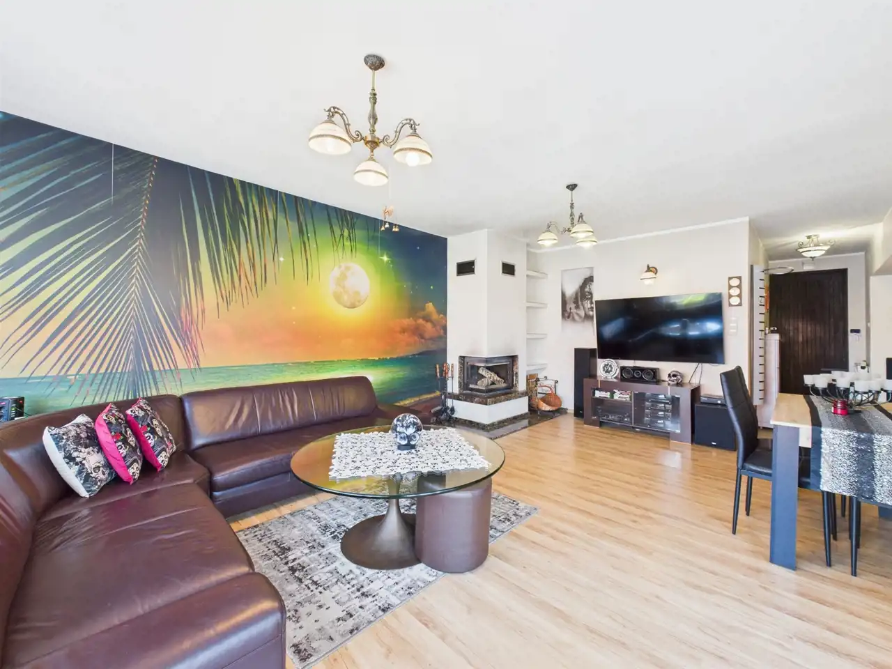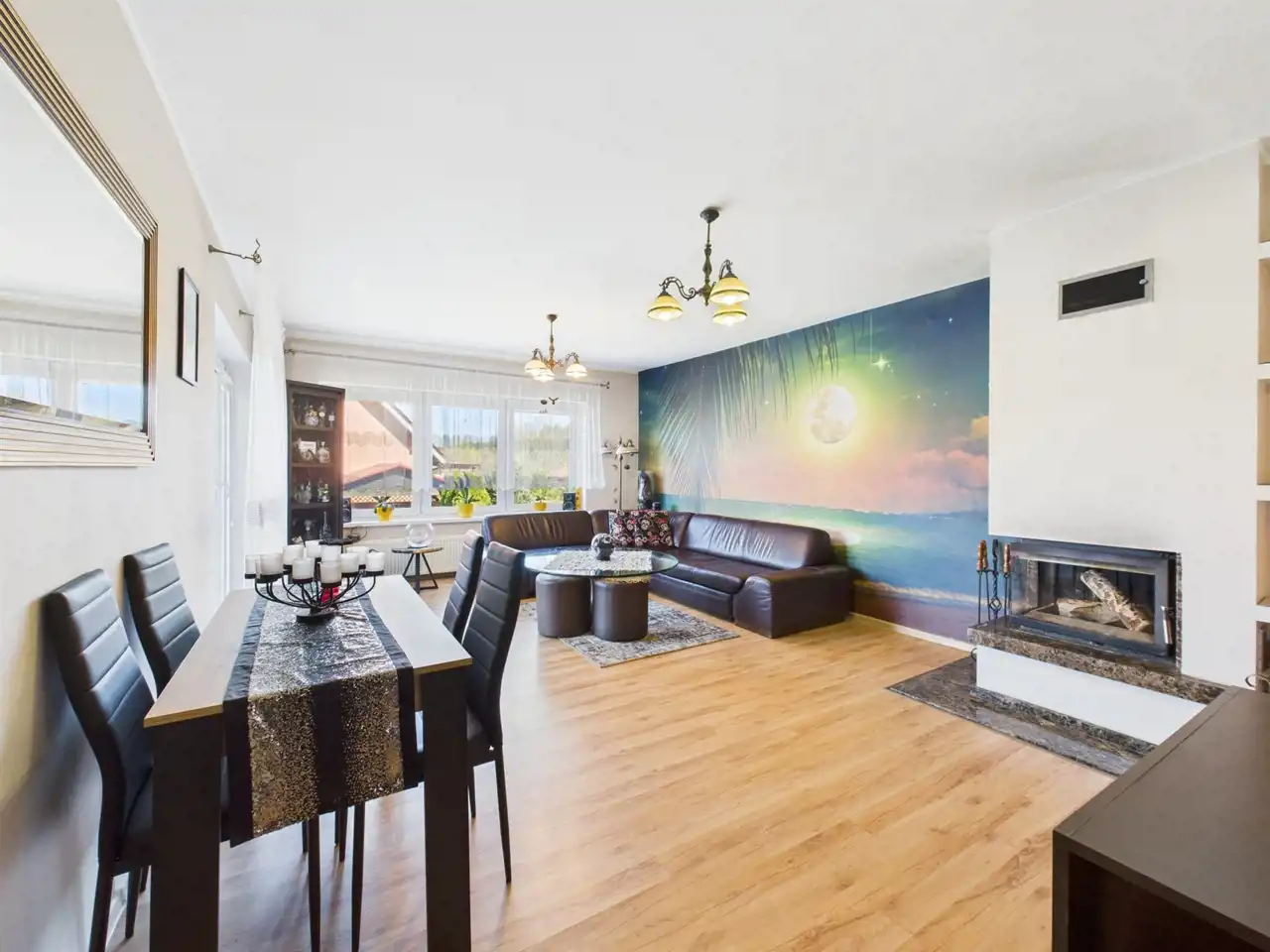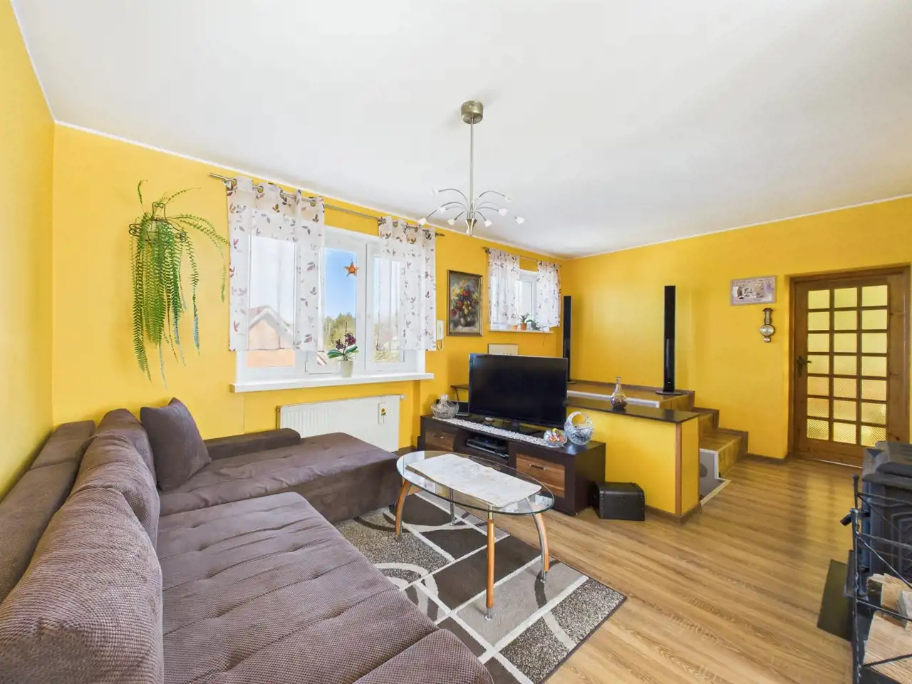 - Duży salon z kominkiem narożnikowym, który wprowadza ciepły klimat, z którego możesz przejść bezpośrednio do ogrodu,