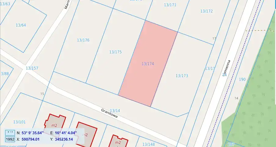 Działka ma regularny kształt prostokąta i położona jest w atrakcyjnym miejscu, na tworzącym się osiedlu nowoczesnych domów.