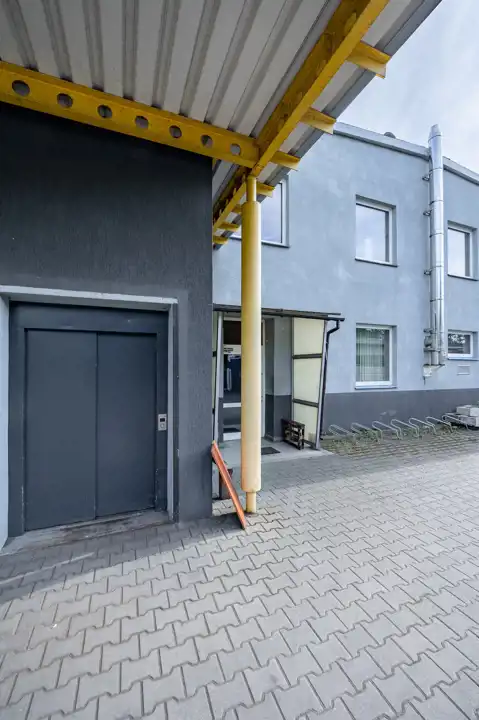 Budynek w części produkcyjnej posiada dwie bramy wjazdowe o wymiarach 3 m na 3 m. Wysokość hali 3,7 m (parter). Wysokość hali 3,05 m (piętro).