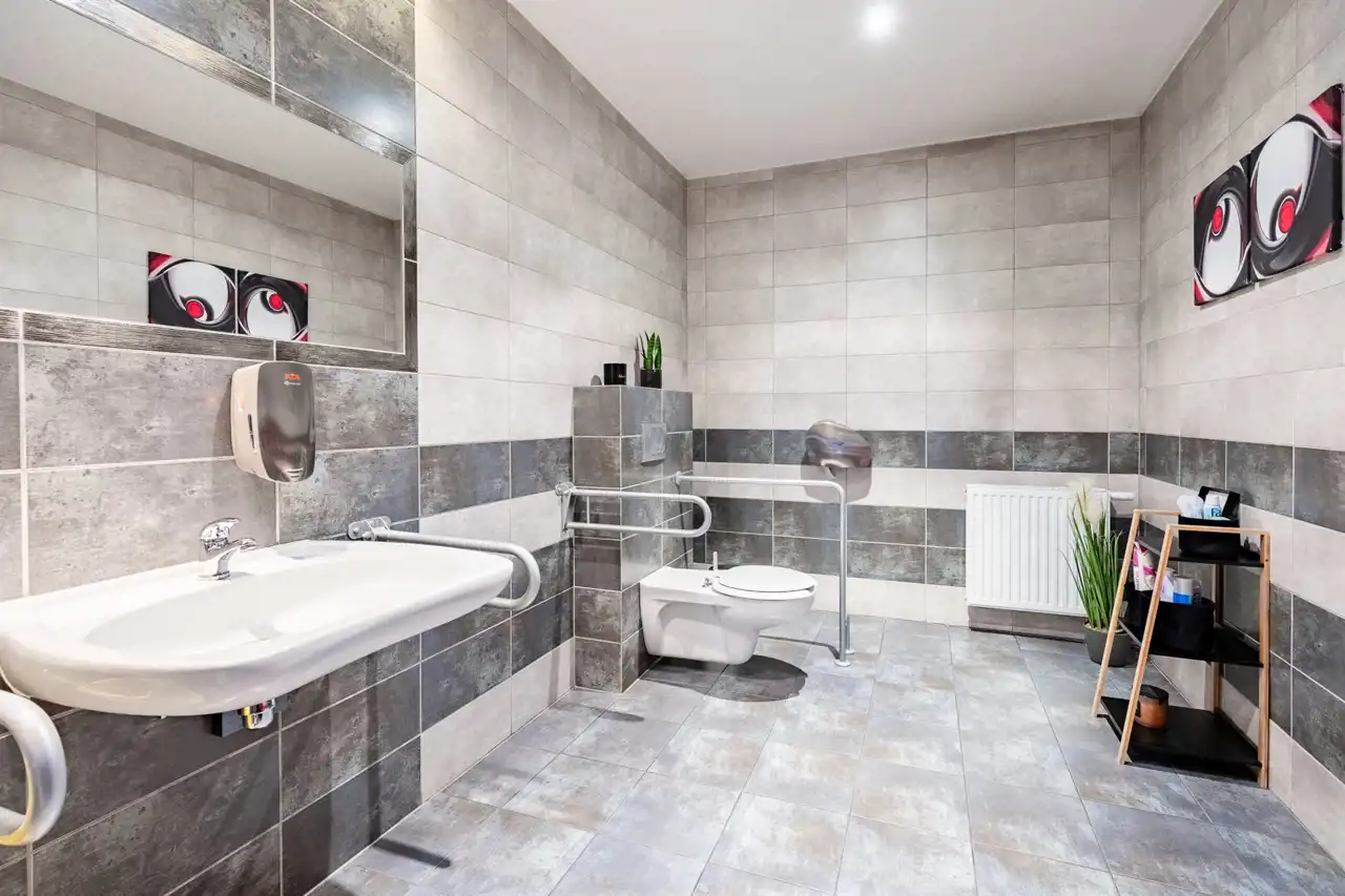 - Pełne zaplecze socjalne: 5 toalet (w tym jedna dla osób niepełnosprawnych), dla pracowników szatnia, w pełni wyposażona kuchnia, pomieszczenia gospodarcze i serwerownia.