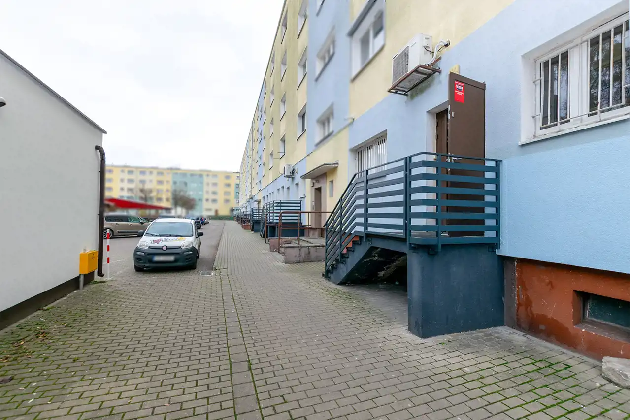 Przed budynkiem znajduje się duża liczba miejsc parkingowych, co stanowi znaczące udogodnienie dla klientów i dostawców.