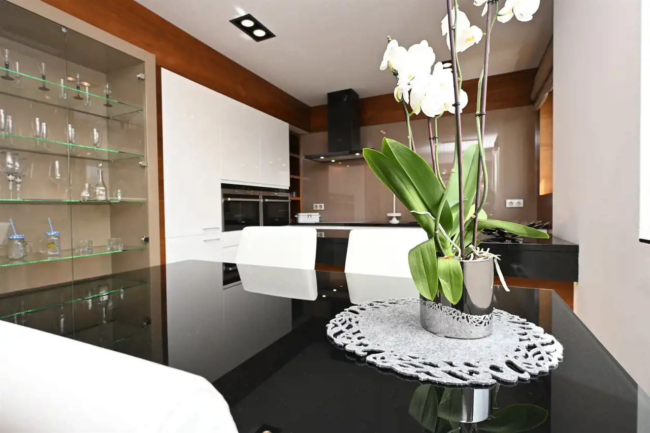 W kuchni –wysokiej klasy zabudowa pod wymiar z blatem z naturalnego granitu oraz pełne wyposażenie w sprzęt AGD (lodówka, piekarnik, płyta grzewcza, okap, zmywarka).