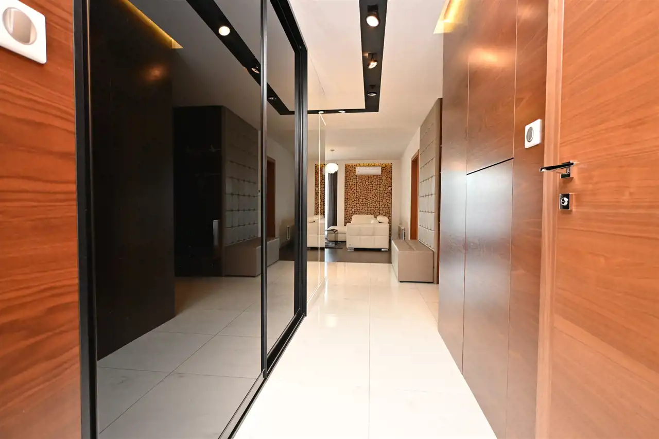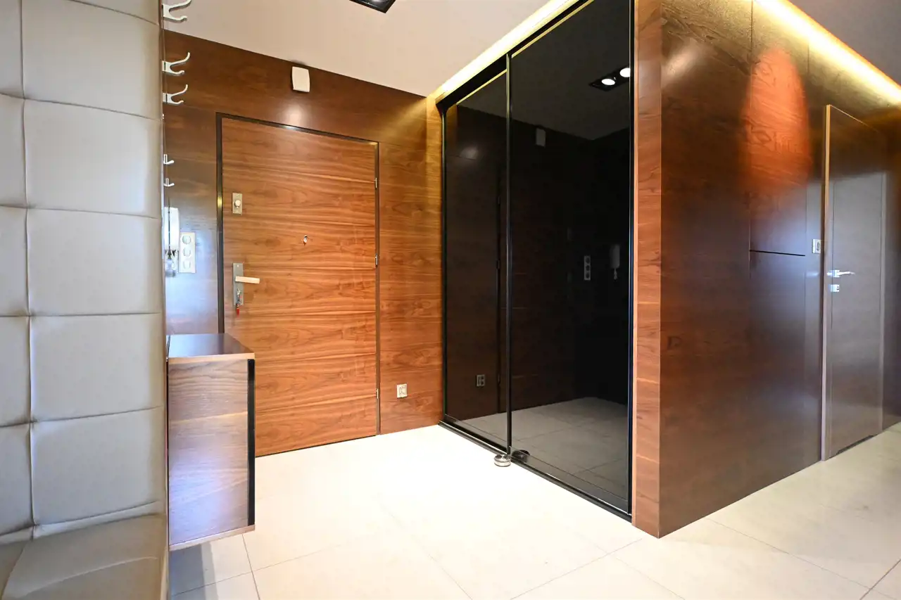 i ponadczasową estetykę. W całym apartamencie wykonano zabudowy na wymiar — od mebli po dekoracyjne zabudowy ścian płytami imitującymi naturalne drewno, a także imponujące lustra, co nadaje wnętrzu elegancki i spójny charakter.