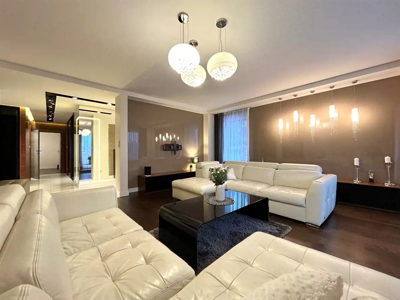 Sercem apartamentu jest przestronny, reprezentacyjny salon o powierzchni 28 m², który zachwyca skalą i możliwościami aranżacyjnymi.