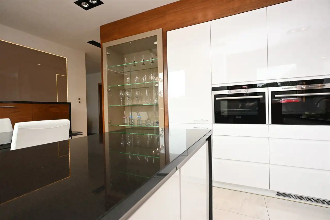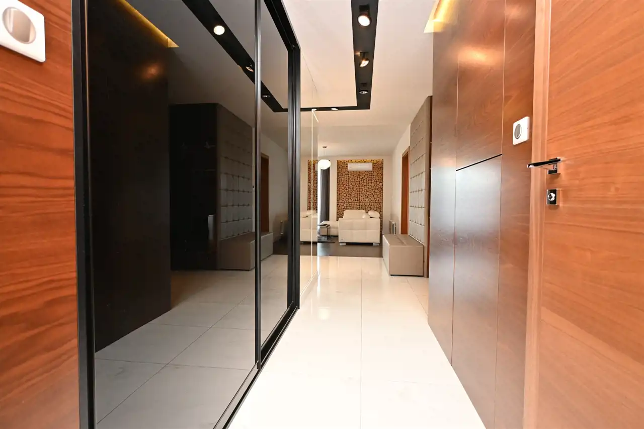 Nieruchomość została zaprojektowana przez projektantkę wnętrz, z dbałością o każdy detal, funkcjonalność i ponadczasową estetykę. W całym apartamencie wykonano zabudowy na wymiar — od mebli po dekoracyjne zabudowy ścian płytami imitującymi naturalne drewno, a także imponujące lustra, co nadaje wnętrzu elegancki i spójny charakter.