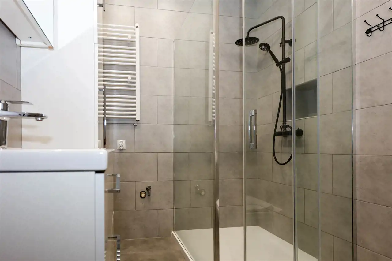 przestronna łazienka z prysznicem i WC, wykończona w nowoczesnym stylu,