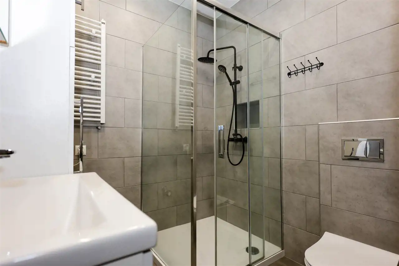 - przestronna łazienka z prysznicem i WC wykończona w nowoczesnym stylu,