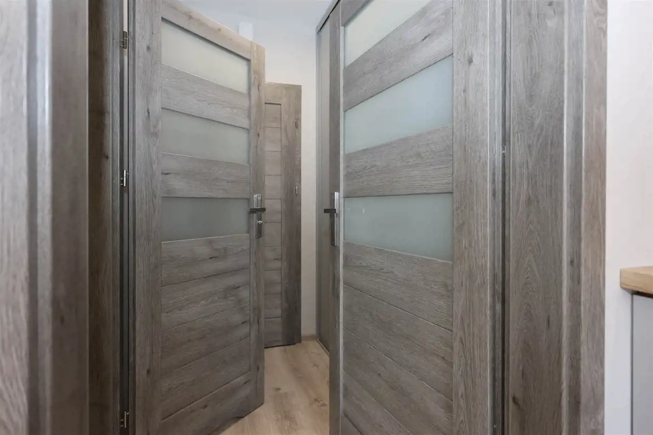 - korytarz oddzielony drzwiami w dużą szafą w zabudowie, oferującą sporo miejsca do przechowywania,