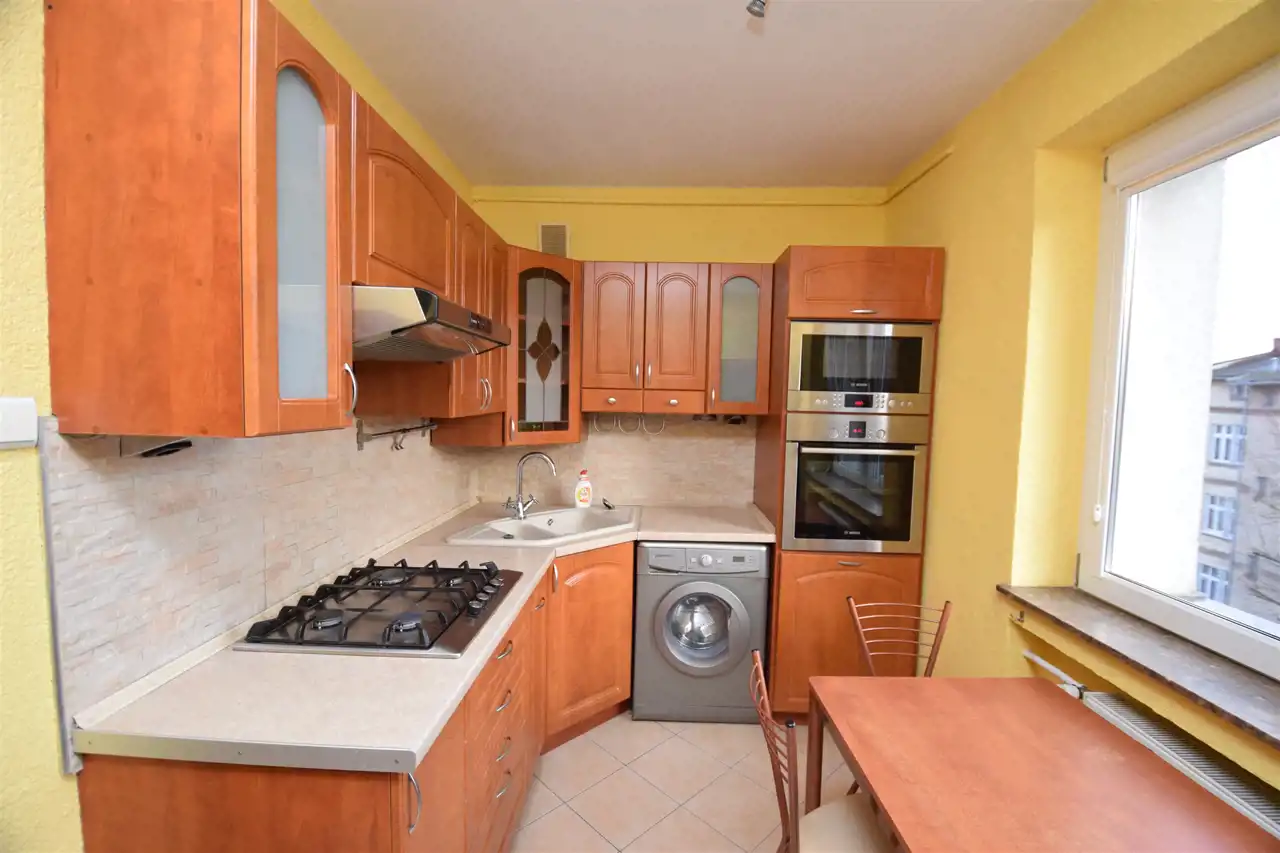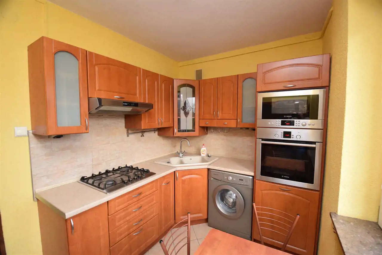 Mieszkanie gotowe do wprowadzenia. W kuchni zabudowa plus sprzęt AGD (chłodziarko-zamrażarka, zmywarka, piekarnik, kuchenka, mikrofala, okap, pralka). W pokojach umeblowanie widoczne na zdjęciach m.in kanapy, szafy, TV.
