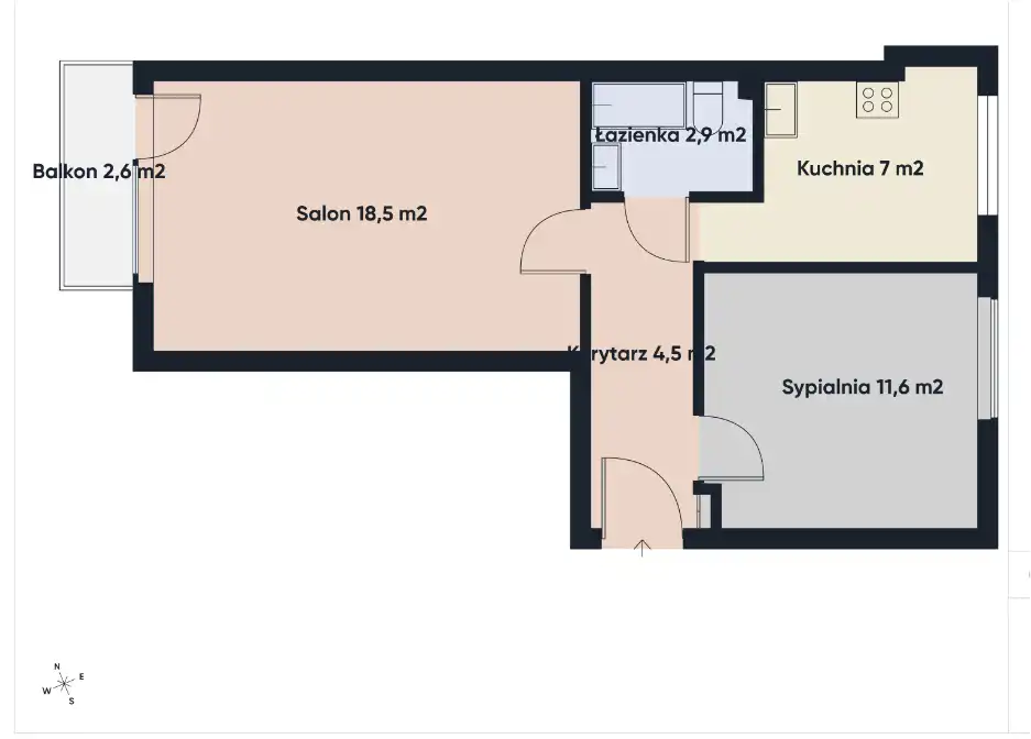 - Charakterystyka mieszkania 45 m2, 2 pokoje