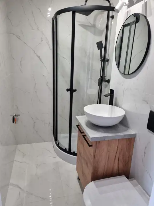 Łazienka w płytkach, z nową armaturą i białym montażem