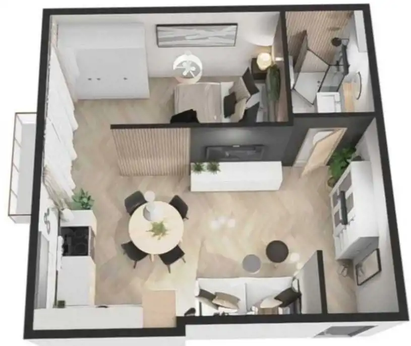 Istnieje możliwość aranżacji wnętrza według projektu widocznego na zdjęciach – posiadam kompletną listę zakupową mebli i dodatków
