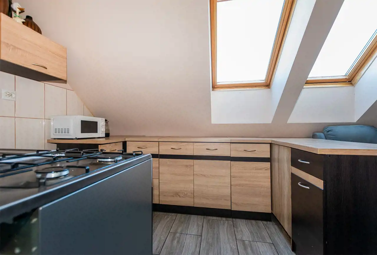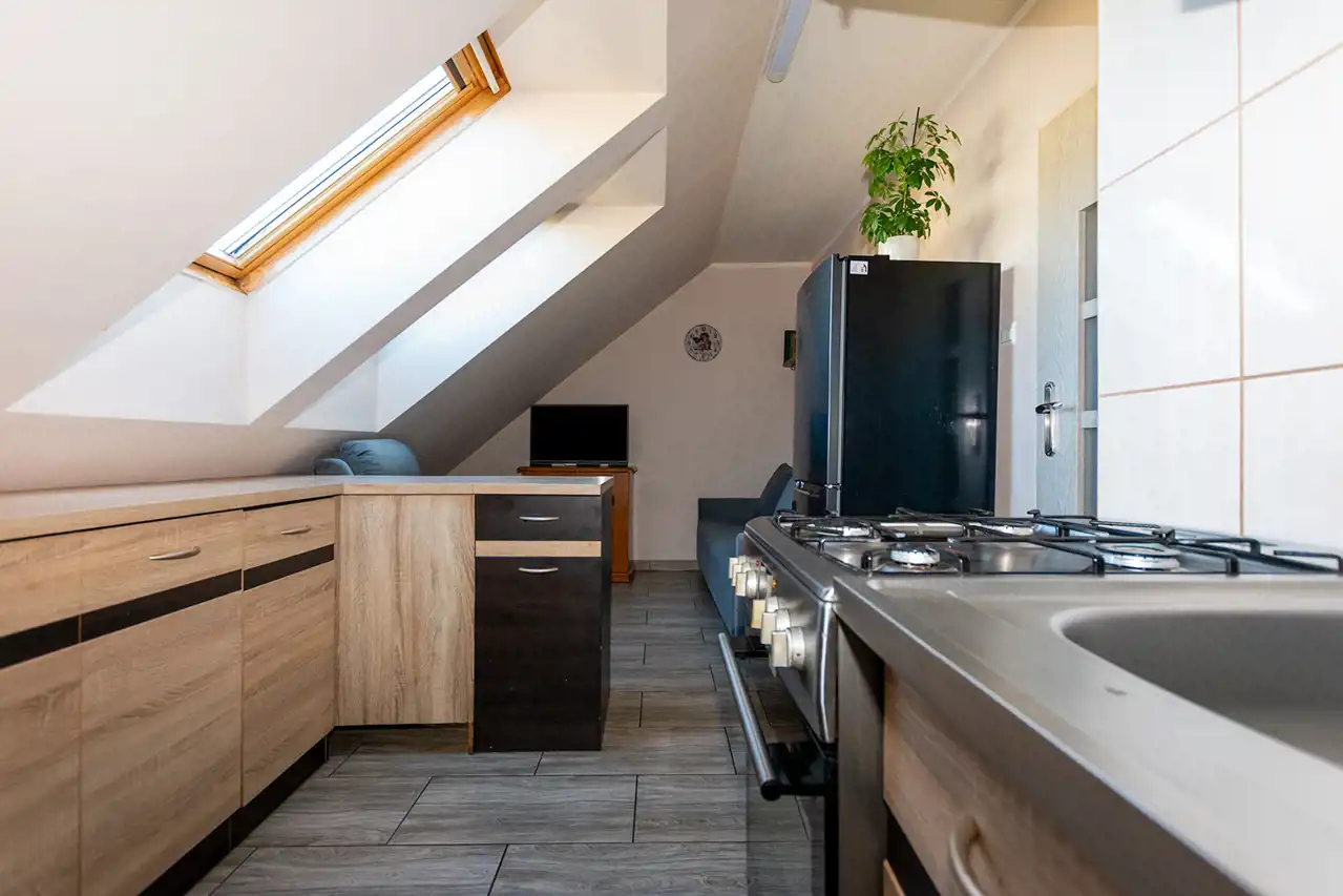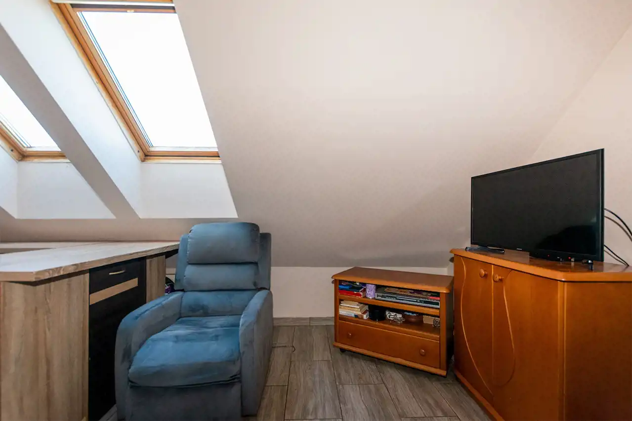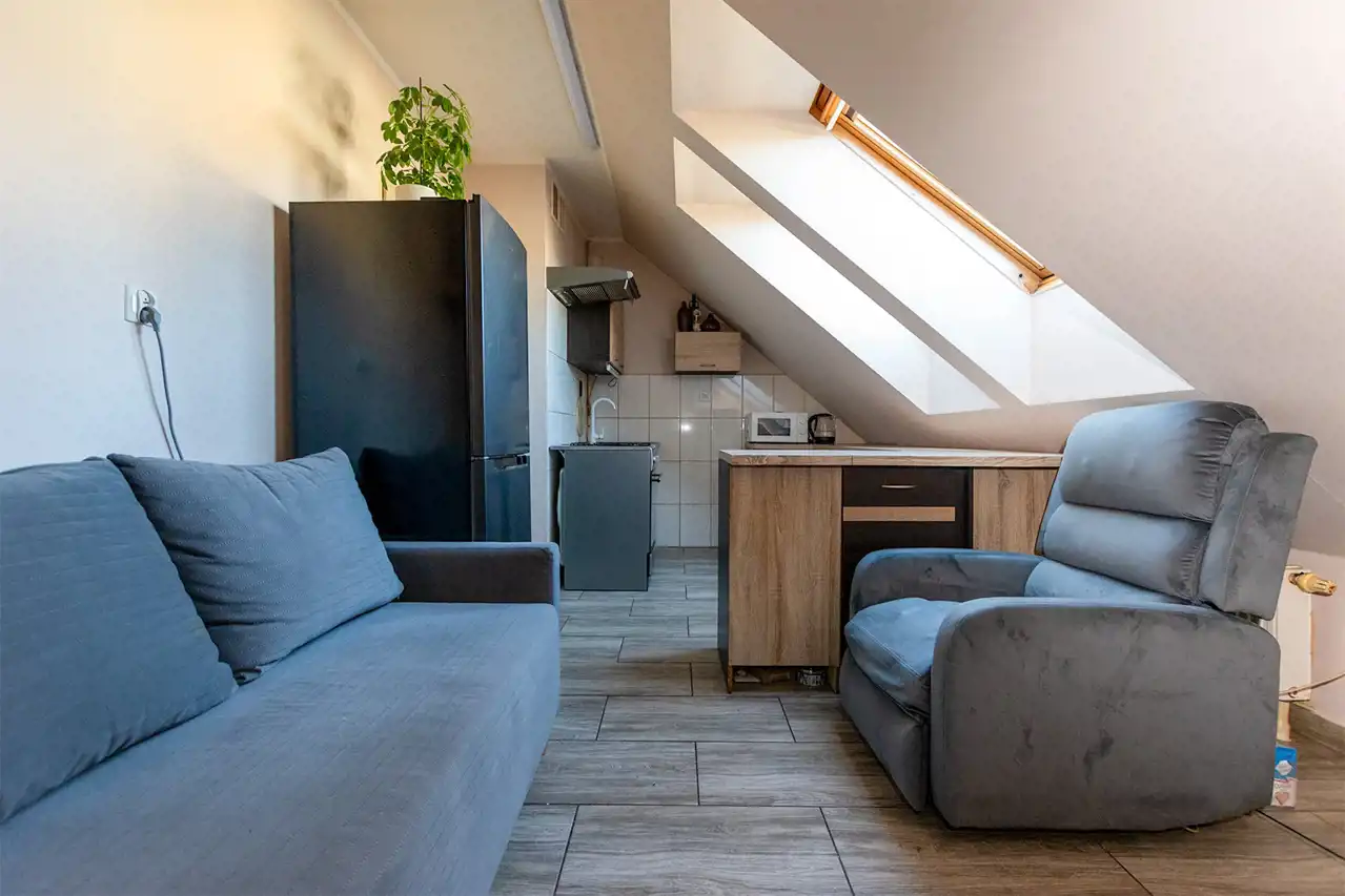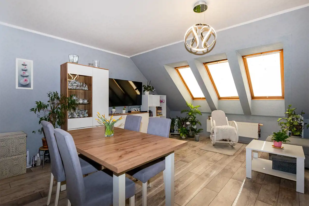 Mieszkanie posiada okna połaciowe, które dobrze doświetlają wnętrze i nadają mu przytulny charakter.