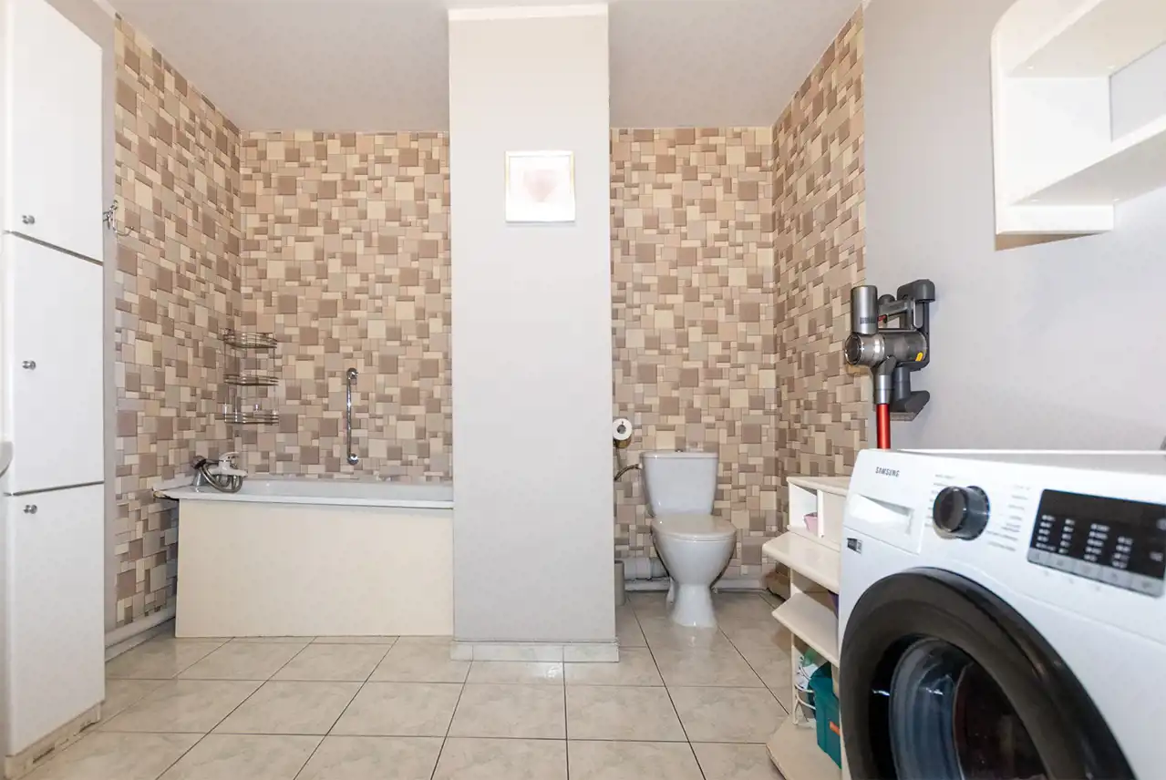 Na wyróżnienie zasługuje bardzo duża łazienka wyposażona w wannę, zlew, WC oraz miejsce na pralkę.