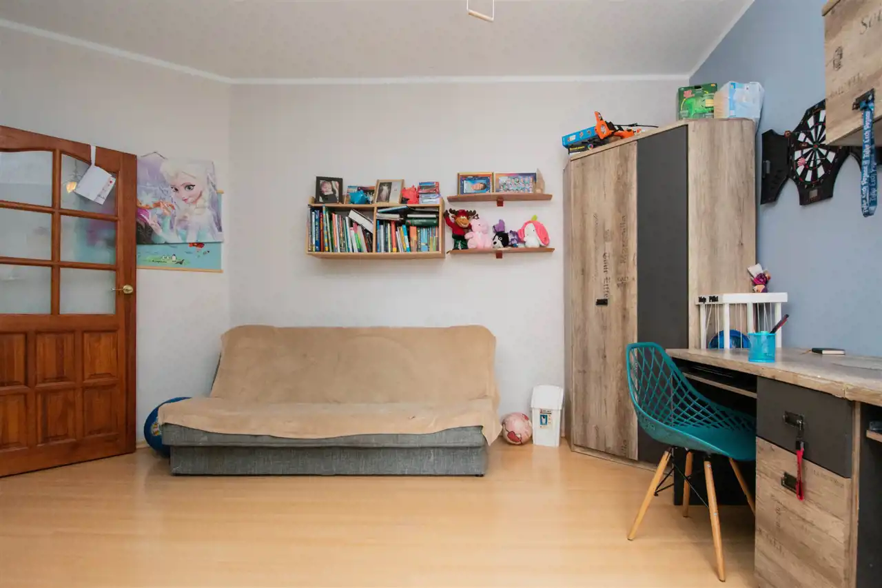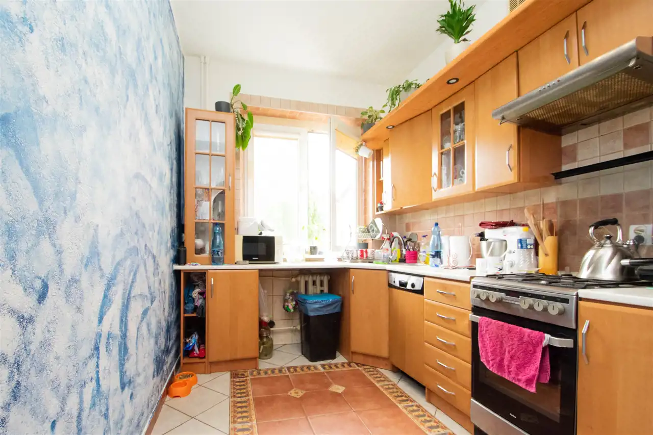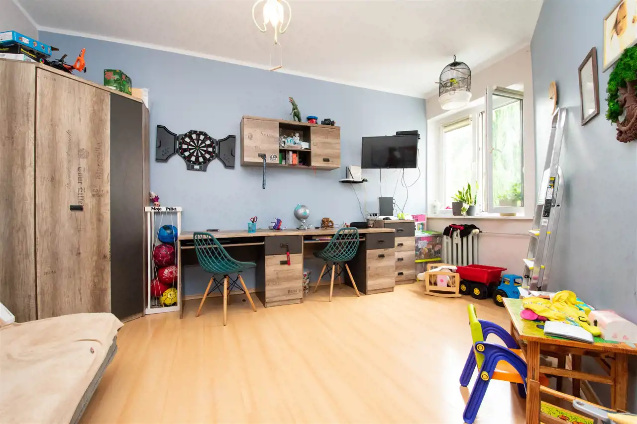 Na podłogach w pokojach panele, w kuchni, łazience i korytarzu płytki. Okna PCV.