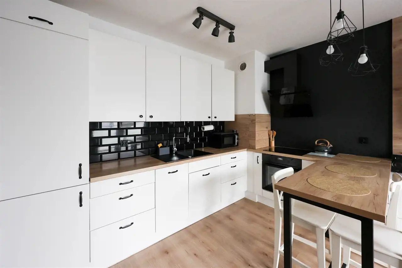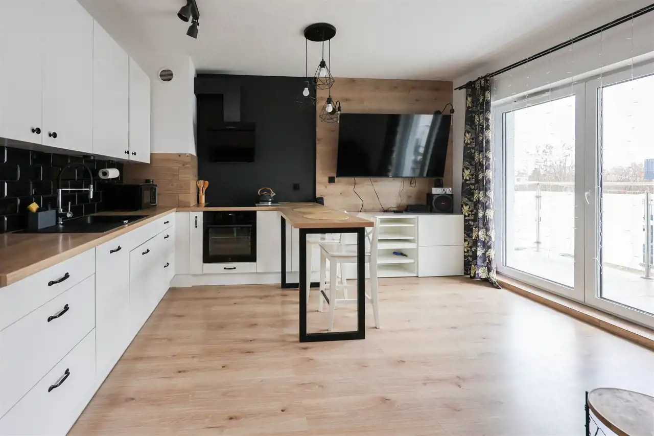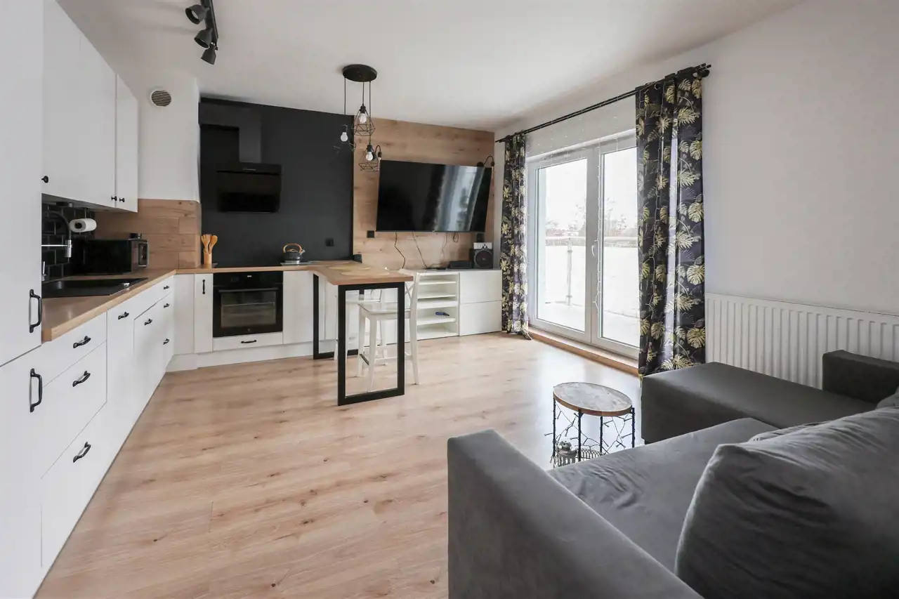 Nieruchomość została zaprojektowana z myślą o maksymalnym wykorzystaniu przestrzeni. Jasny salon połączony z funkcjonalnym aneksem kuchennym tworzy spójną i wygodną strefę dzienną. Nowoczesna zabudowa kuchenna zapewnia komfort codziennego użytkowania, a starannie dobrane wyposażenie podkreśla estetykę wnętrza.