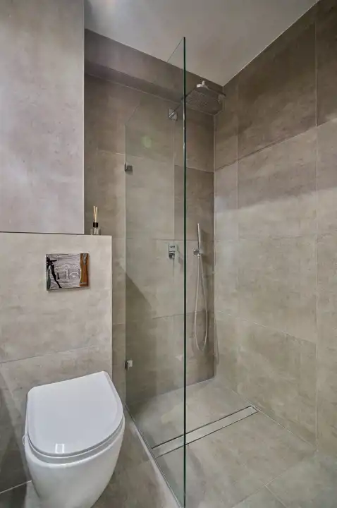 Łazienka została wykończona w surowym, nowoczesnym stylu inspirowanym betonem architektonicznym. Znajdziesz tu prysznic typu walk-in z odpływem liniowym oraz WC na stelażu typu Geberit. Minimalizm, estetyka i funkcjonalność w jednym.