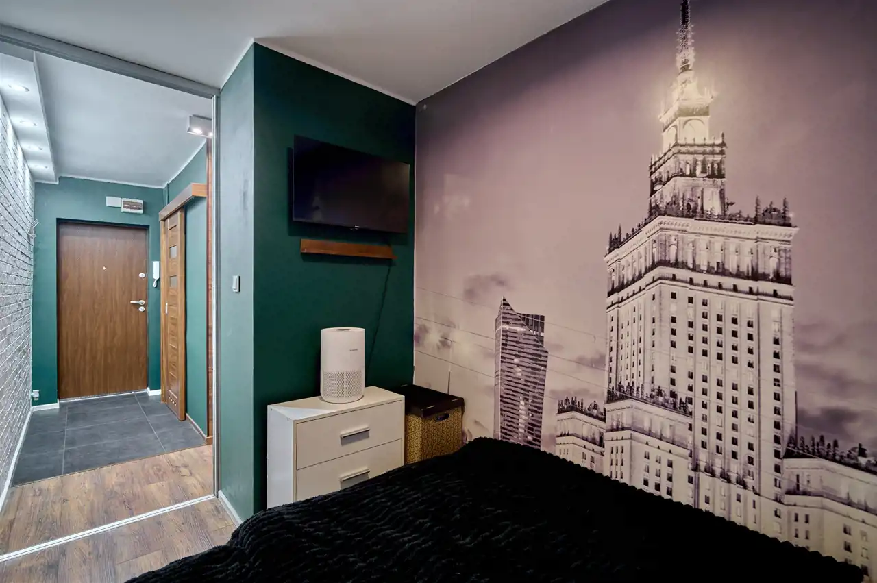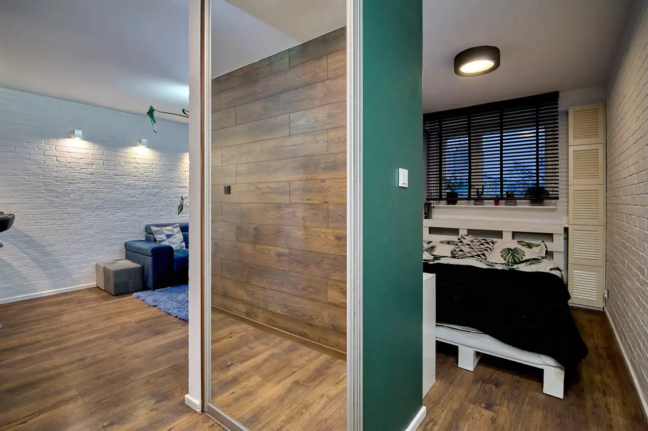W przedpokoju znajduje się pojemna szafa w zabudowie. Ciekawym, designerskim rozwiązaniem są przesuwne drzwi do sypialni z lustrem – identyczne jak front szafy. Lustro optycznie powiększa przestrzeń, a jednocześnie dyskretnie ukrywa wejście do sypialni, nadając wnętrzu nowoczesny charakter.