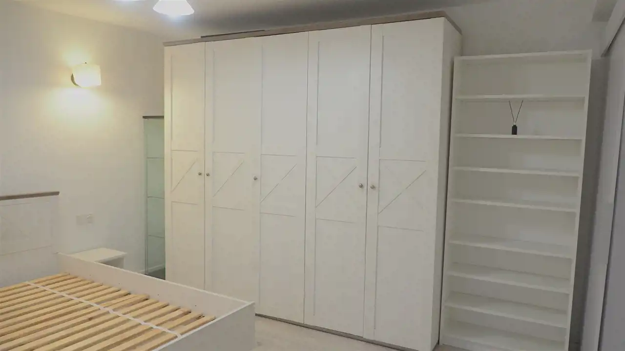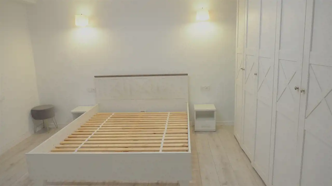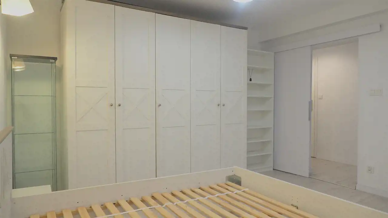 - sypialnia z łóżkiem dwuosobowym, szafkami nocnymi, dużą pojemną szafą, regałem,