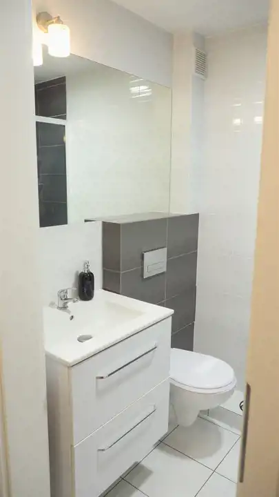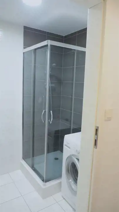 - łazienka z kabiną prysznicową , umywalką, pralką,