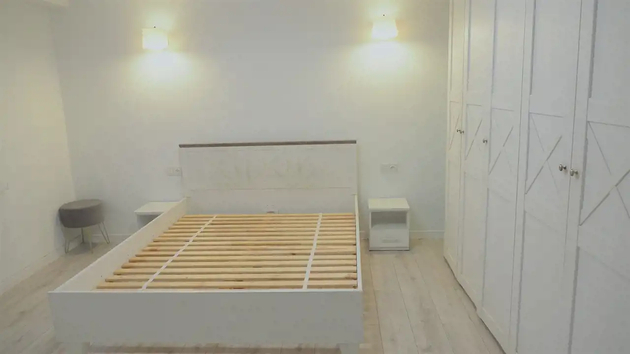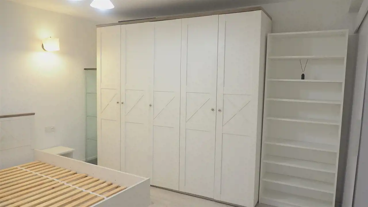 - sypialnia z łóżkiem dwuosobowym, szafkami nocnymi, dużą pojemną szafą , regałem,