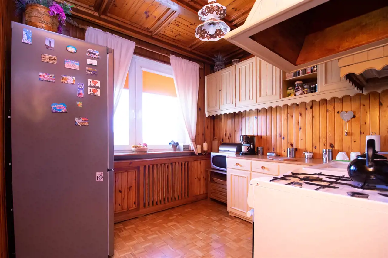 - jasna i osobna kuchnia o powierzchni 7 m2 na podłodze parkiet, ściany pokryte boazerią;