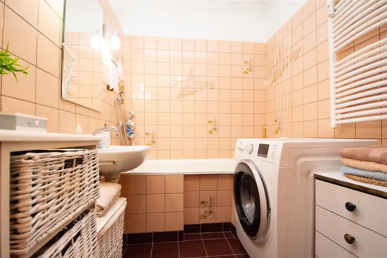 - łazienka z wanną o powierzchni 3,2 m2, na ścianach oraz na podłodze płytki;