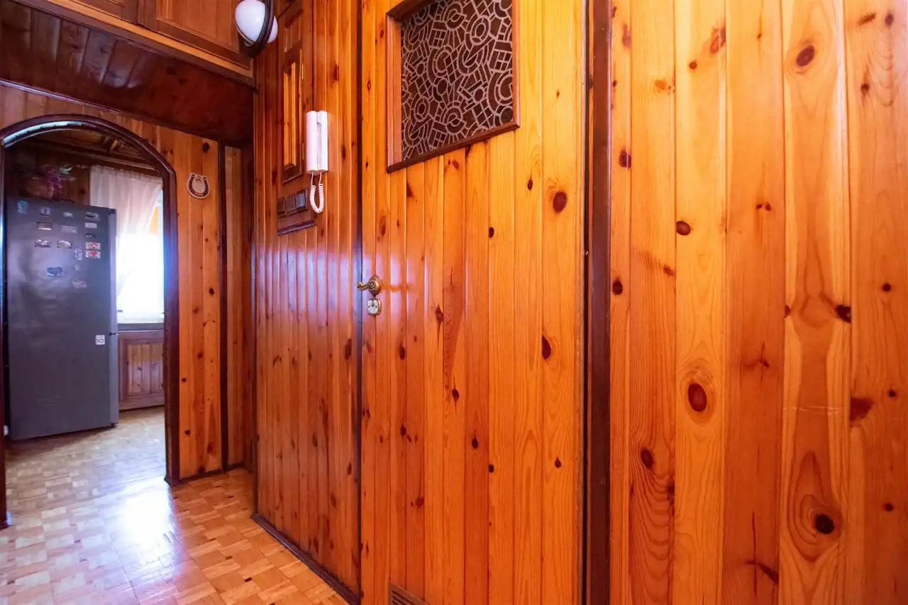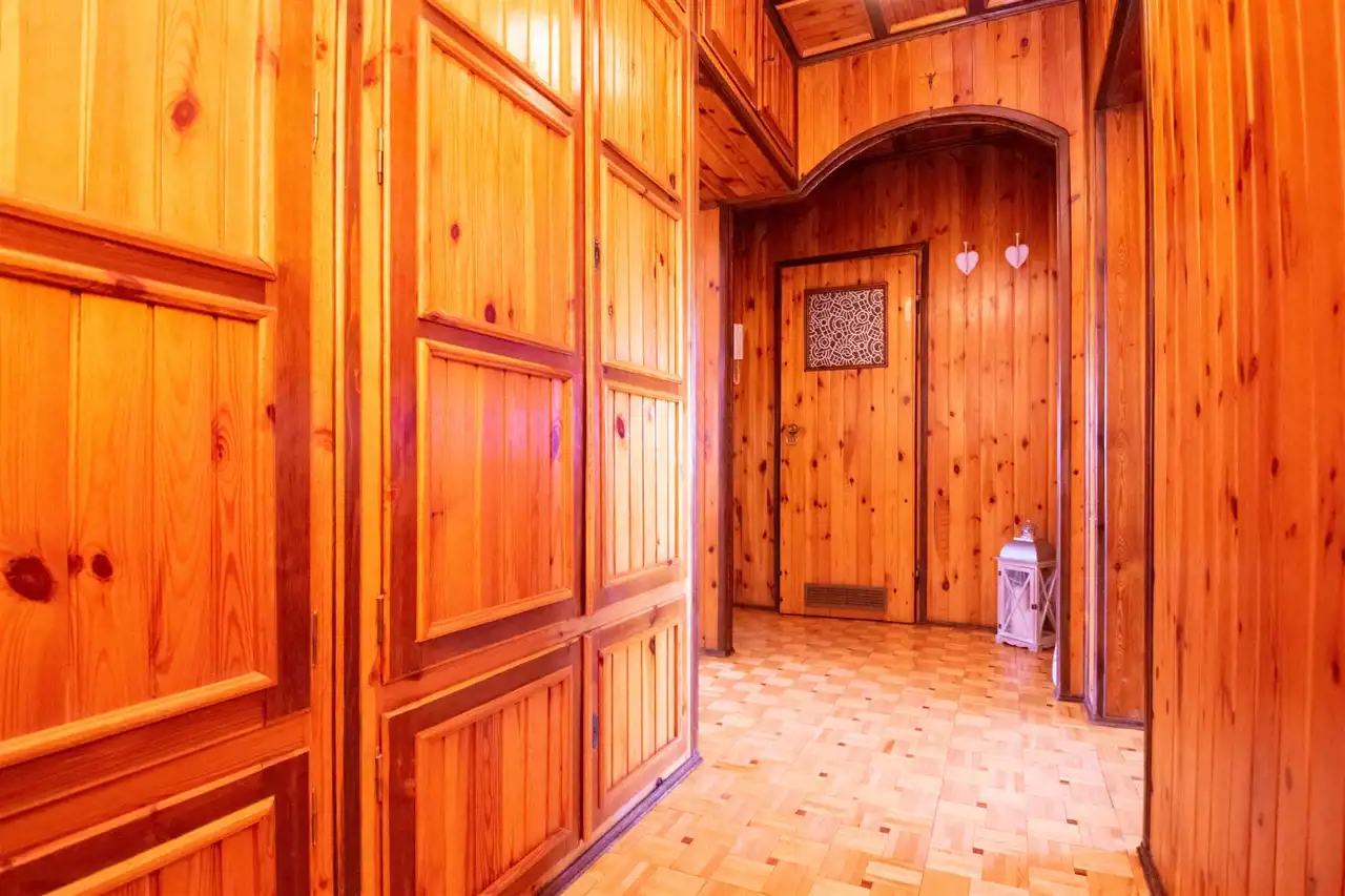 - przedpokój o łącznej powierzchni 7 m2, na podłodze parkiet, ściany pokryte boazerią. W tym pomieszczeniu znajduję się duża szafa w zabudowie.