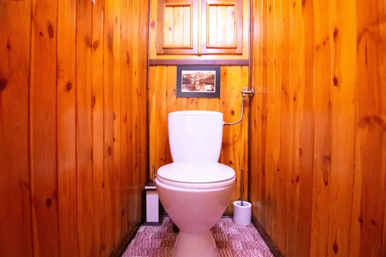 - WC o powierzchni 1 m2, na podłodze płytki, ściany wyłożone boazerią;