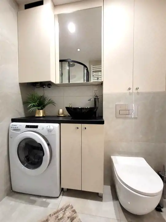 kabina prysznicowa, podwieszana toaleta, szafkami w zabudowie, lustro, pralka