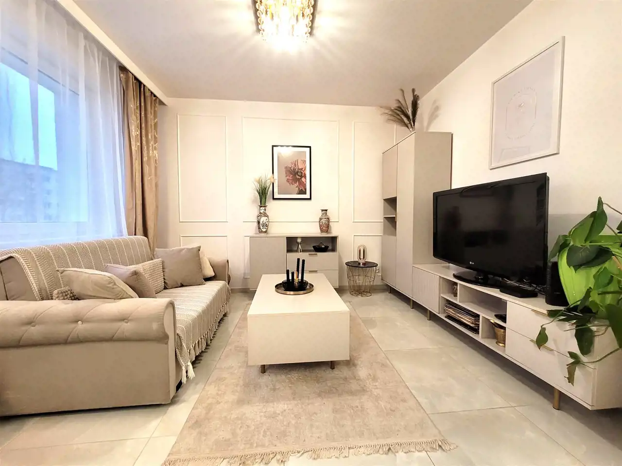 Apartament urządzony został z dbałością o każdy detal, w jasnych i ponadczasowych tonacjach beżu, kaszmiru i bieli, z użyciem materiałów wysokiej klasy.