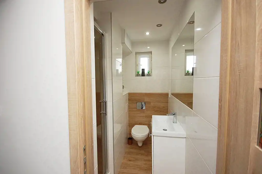 4.Łazienka-ok 3,502 całość w glazurze i terakocie,kabina prysznicowa,umywalka z szafką łazienkową,grzejnik drabinkowy
