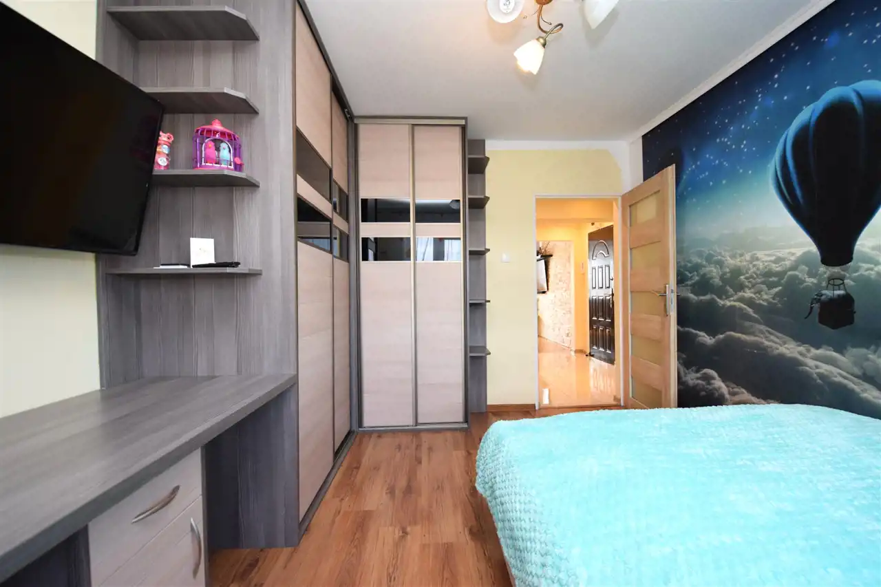 - sypialnia o pow. 12,3m² z łóżkiem dwuosobowym, szafą typu komandor i biurkiem robionymi na wymiar