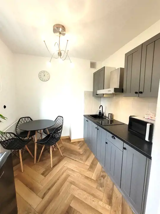 gustowna zabudowa kuchenna, ma wyposażeniu sprzęt AGD tj. płyta indukcja, okap, zmywarka, lodówka, kuchenka mikrofalowa, stół jadalny i 4 krzesła