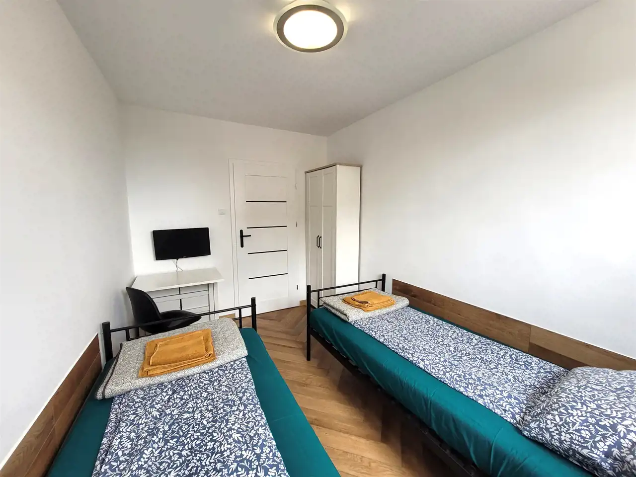 dwa łóżka pojedyncze, pojemna szafa ubraniowa, biurko,