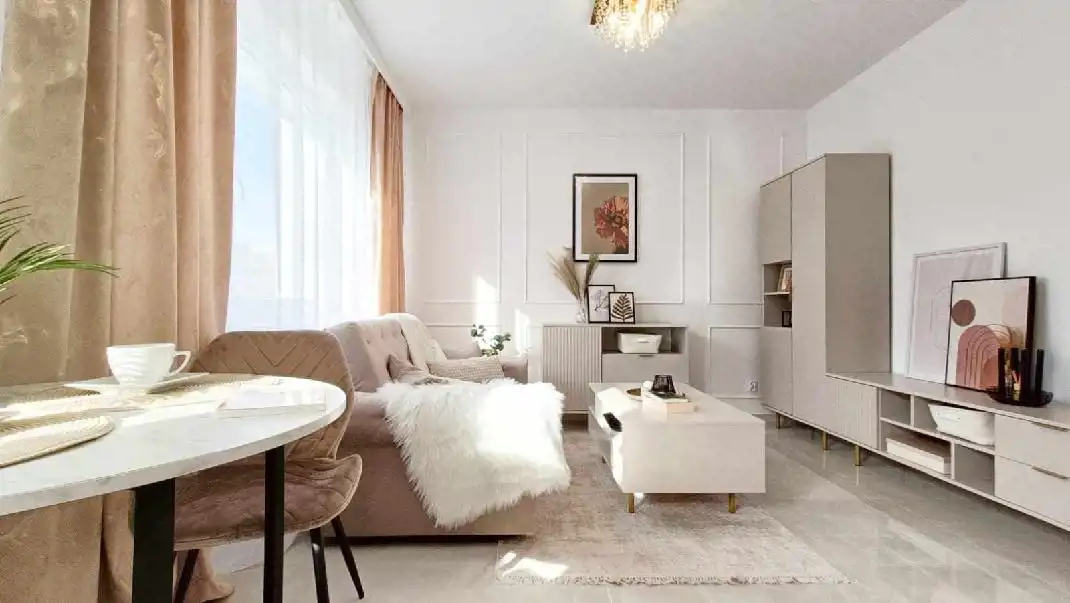 Apartament urządzony został z dbałością o każdy detal, w jasnych, ponadczasowych tonacjach beżu, kaszmiru i bieli, z użyciem materiałów wysokiej klasy.