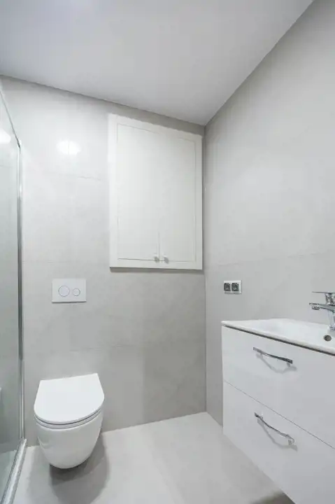 Remont wykonano kompleksowo – skute zostało wszystko aż do muru, a cały lokal zyskał nowe życie na poziomie premium.