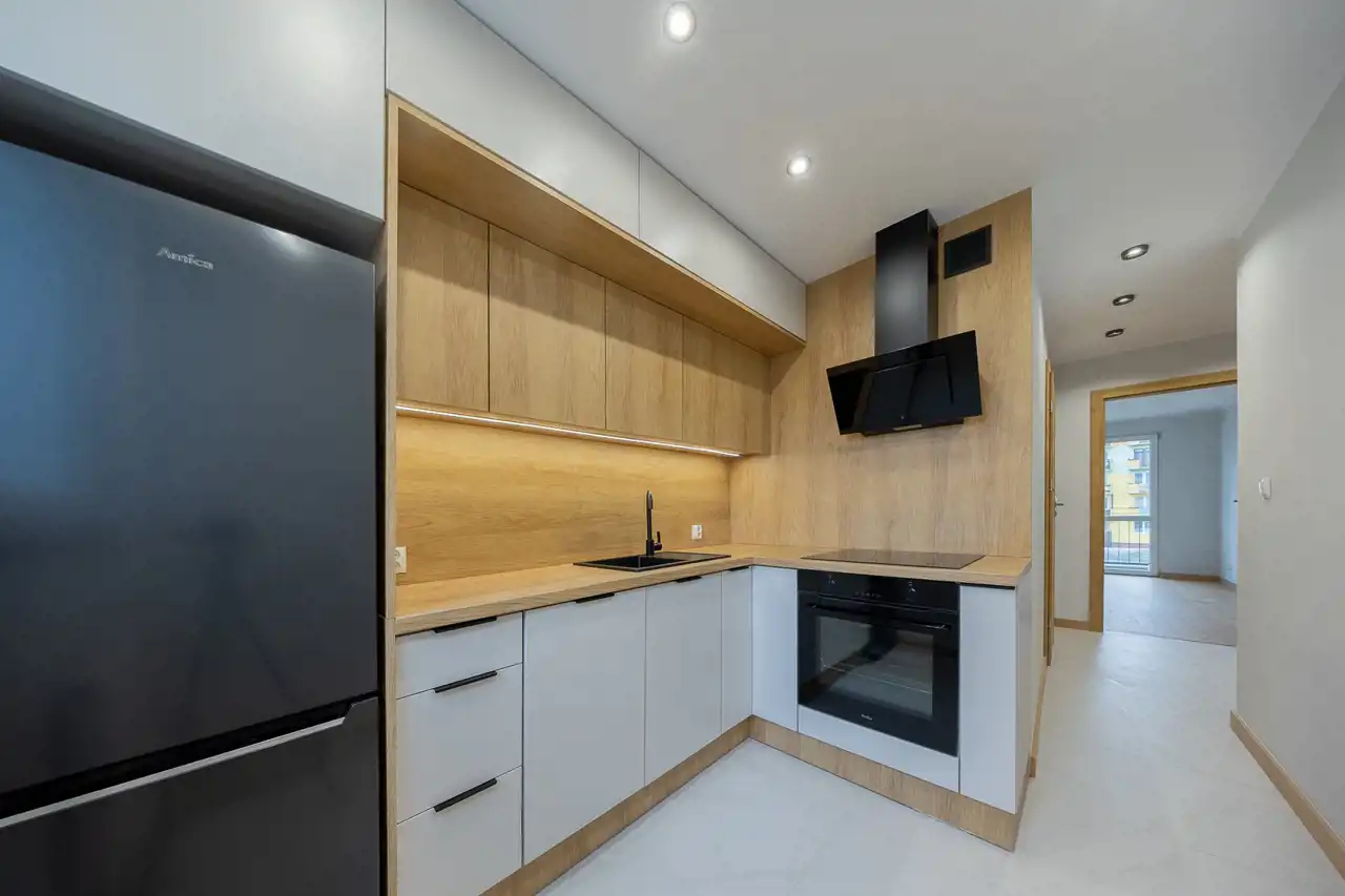 Remont wykonano kompleksowo – skute zostało wszystko aż do muru, a cały lokal zyskał nowe życie na poziomie premium. Na podłogach znajdują się panele wysokiej jakości, ściany karton - gips, podwieszane sufity, a wszystkie instalacje wykonano od nowa. W kuchni zamontowano nowoczesną zabudowę na wymiar wraz z nowym sprzętem AGD na gwarancji, a w łazience zamontowano kompletne, nowe wyposażenie łazienkowe — od ceramiki i armatury po dużą kabinę prysznicową oraz wysokiej jakości płytki.