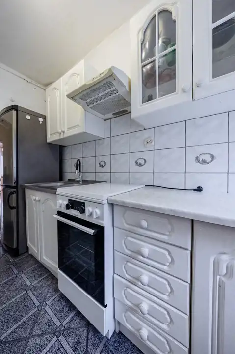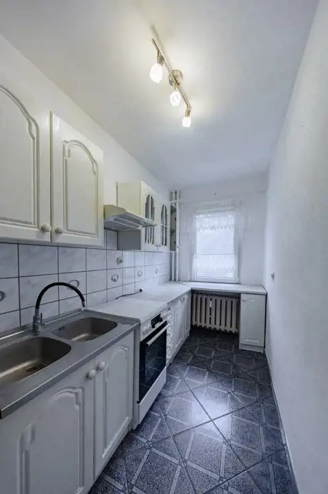 Oddzielna, funkcjonalna kuchnia wyposażona jest w nowoczesne meble systemowe oraz okno, które zapewnia naturalne światło i wentylację.