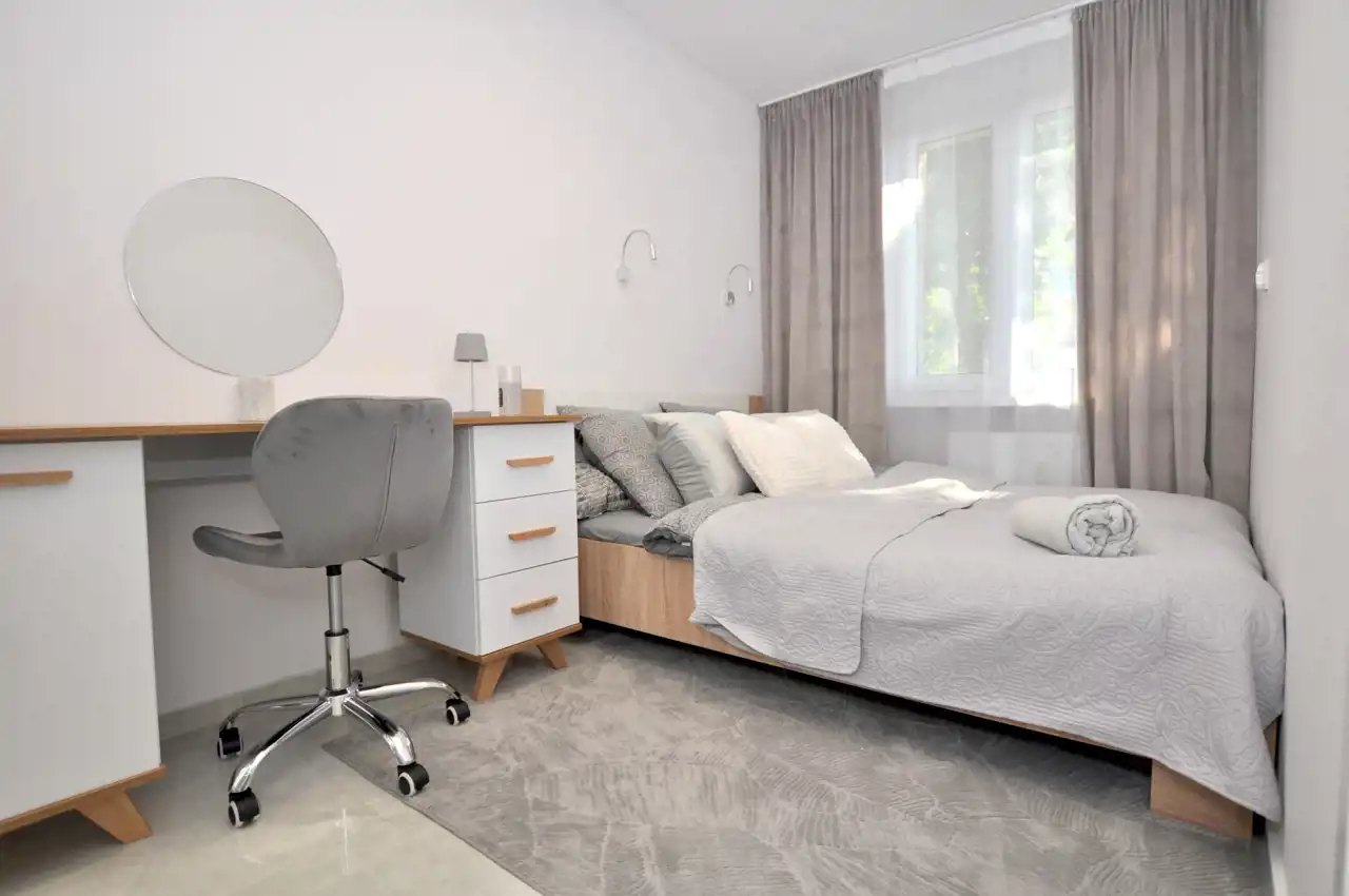 • Sypialnia – komfortowe łóżko małżeńskie z wysokiej klasy materacem, pojemna szafa z lustrem, miejsce do pracy/nauki