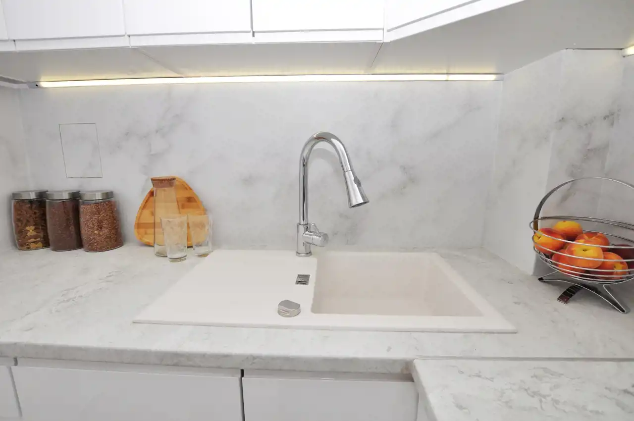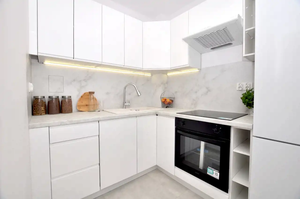 • Kuchnia – w pełni wyposażona, nowoczesne meble na wymiar oraz sprzęt AGD renomowanych marek (piekarnik, płyta indukcyjna, zmywarka, lodówka-zamrażarka), oświetlenie LED nad blatem