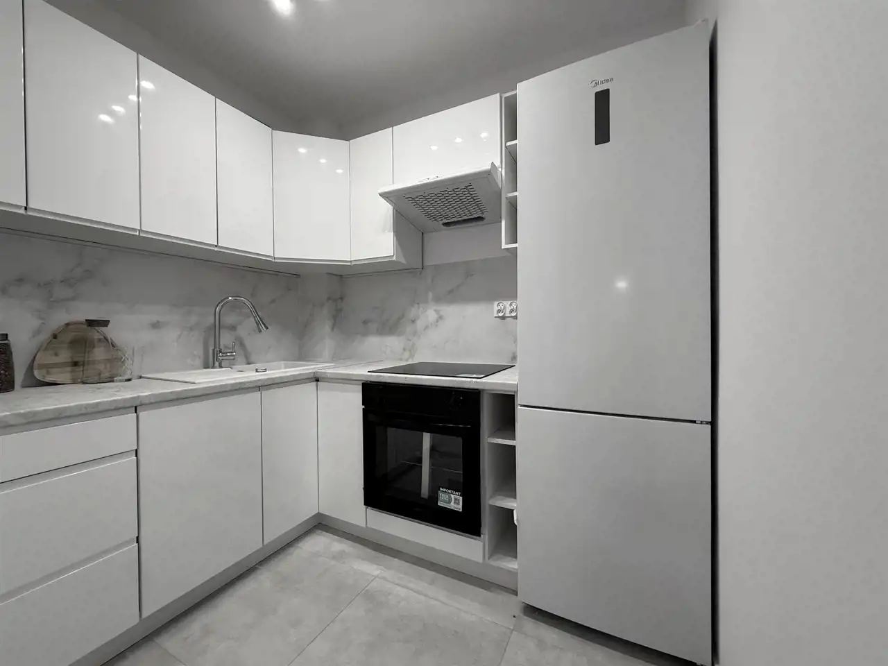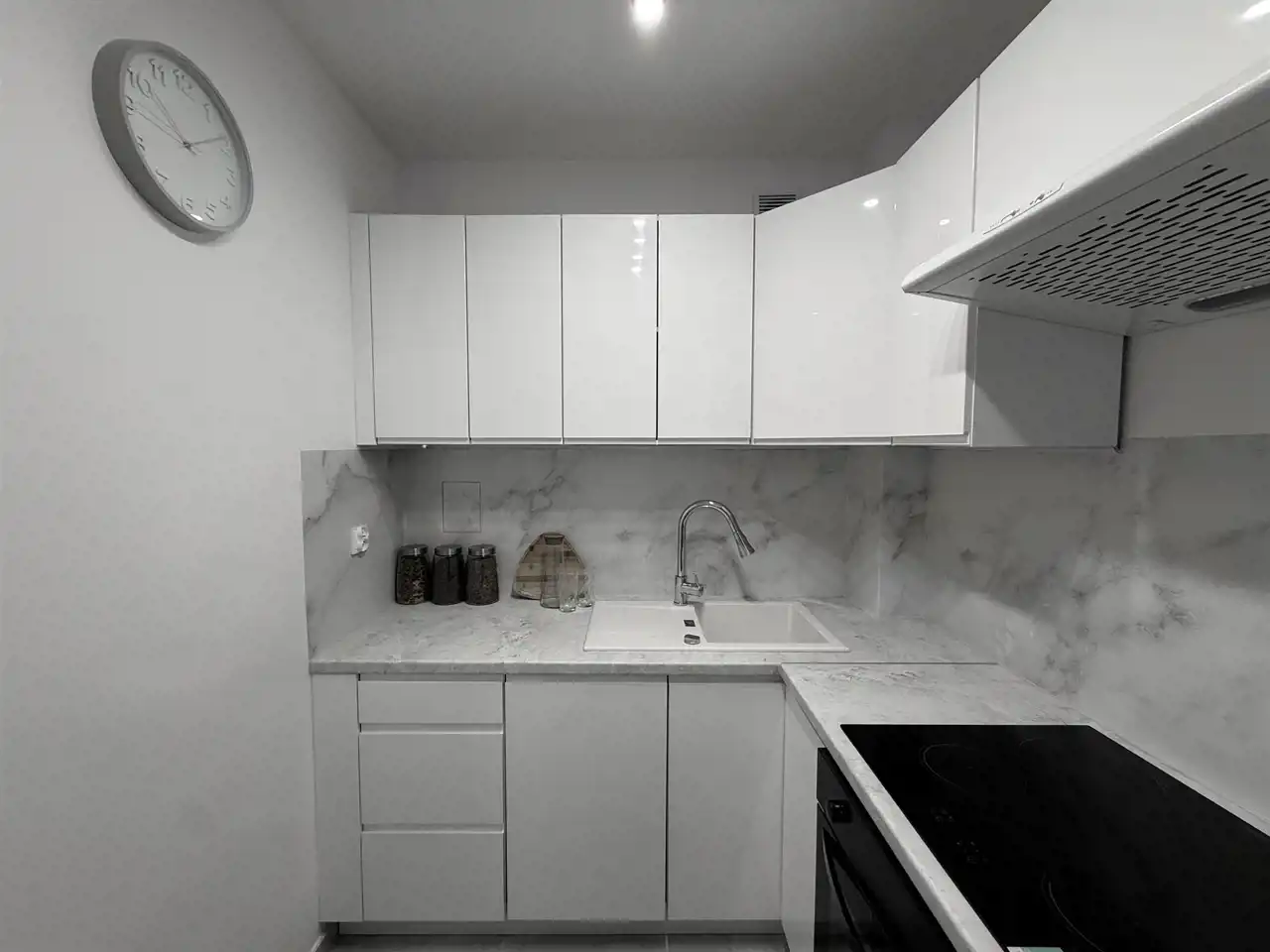 • Kuchnia – w pełni wyposażona, nowoczesne meble na wymiar oraz sprzęt AGD renomowanych marek (piekarnik, płyta indukcyjna, zmywarka, lodówka-zamrażarka), oświetlenie LED nad blatem