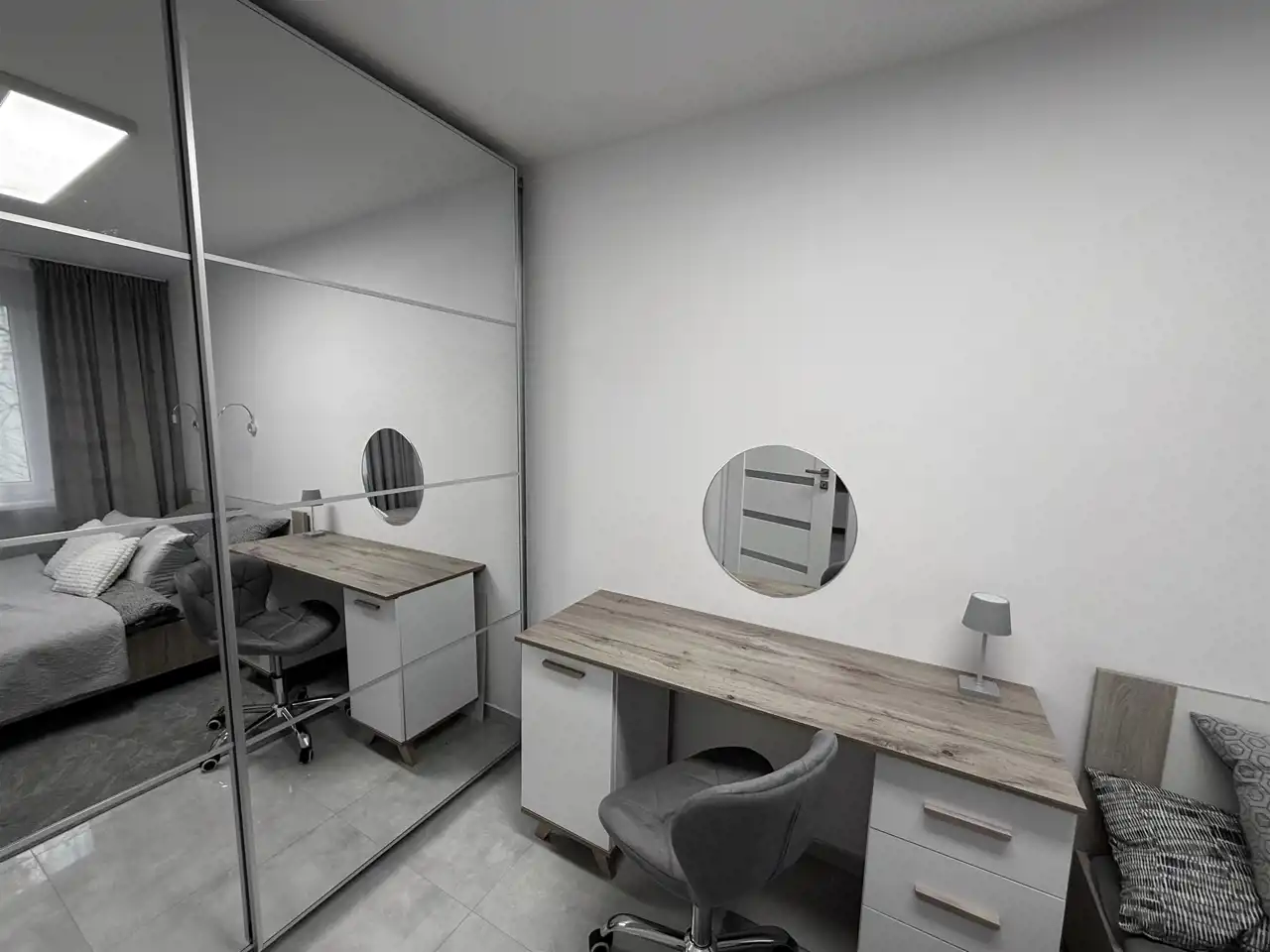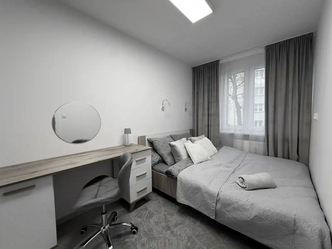 • Sypialnia – komfortowe łóżko małżeńskie z wysokiej klasy materacem, pojemna szafa z lustrem, miejsce do pracy/nauki