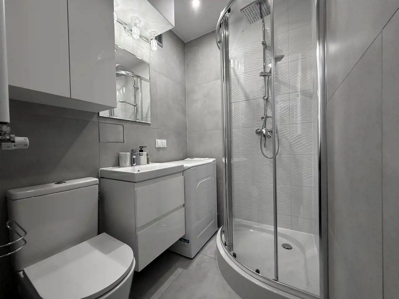 • Łazienka – kabina prysznicowa z deszczownicą, elegancka armatura, pralka, zabudowa meblowa