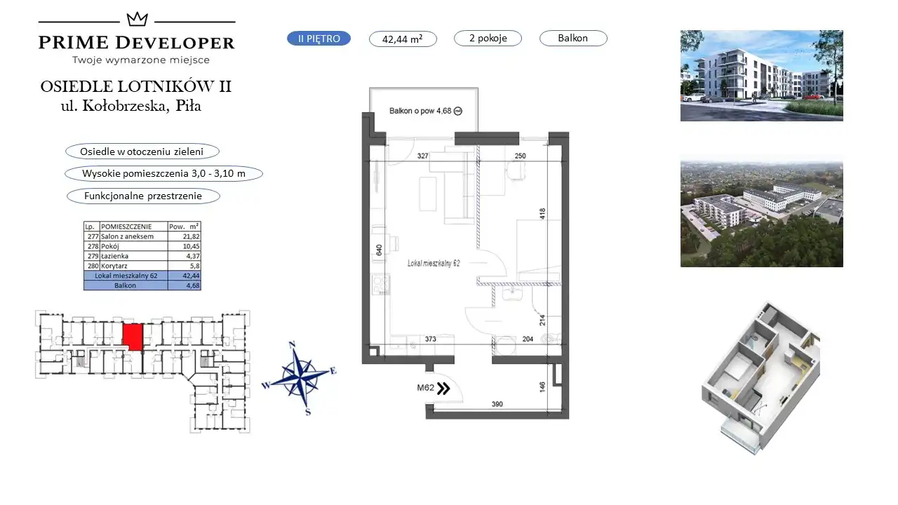MIESZKANIE 2 POKOJOWE O POW. 42,44m2, II PIĘTRO, BALKON