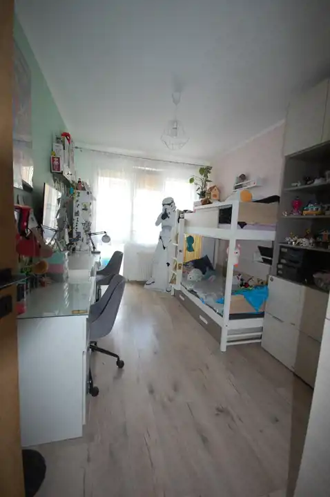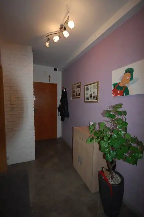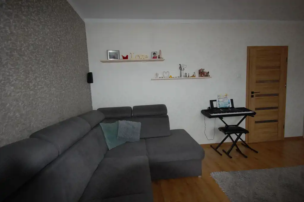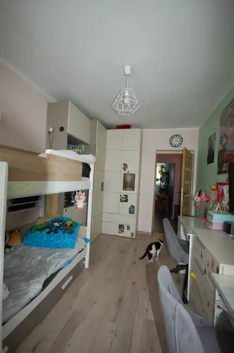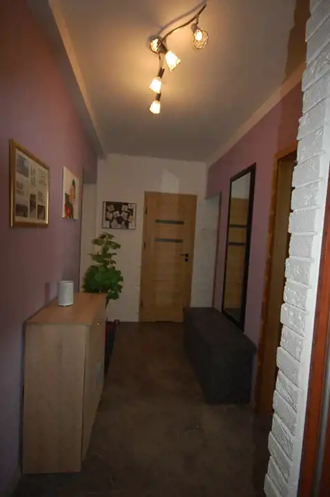 Pokój 2 : o powierzchni 12,29 m2 - ściany częściowo gipsowane, malowane, częściowo tapety. Na podłodze nowe panele podłogowe. W pokoju również zabudowa meblowa (szafki oraz szafa narożnikowa) .W pokoju znajduje się okno PCV z wyjściem na balkon. W oknach rolety wewnętrzne.