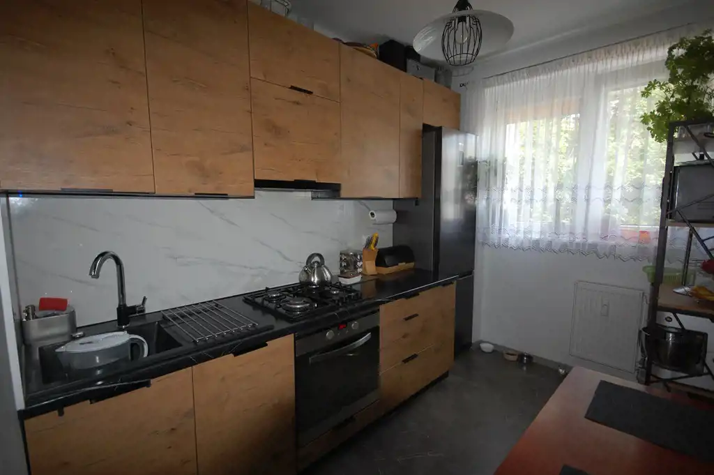 Kuchnia : o powierzchni 7,93 m2 - meble z nowoczesną zabudową kuchenną , płyta gazowa firmy Amica, zmywarka Bosch, okap kuchenny, jednokomorowy zlew, lodówka .W kuchni halogeny ,w meblach kuchennych podświetlenie LED. Ściany - po jednej stronie tynk ozdobny, po drugiej stronie tzw.fartuch kuchenny -nowoczesna glazura. Okna PCV, rolety wewnętrzne.