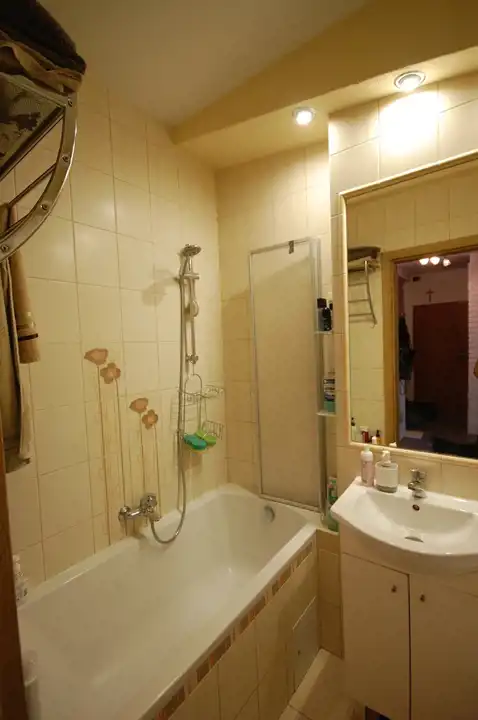 Łazienka : o powierzchni 3,08 m2 - glazura nowego typu ,razem z WC, szafka pod umywalkę,2 szafki wiszące ,wanna -parawan prysznicowy, oświetlenie.
